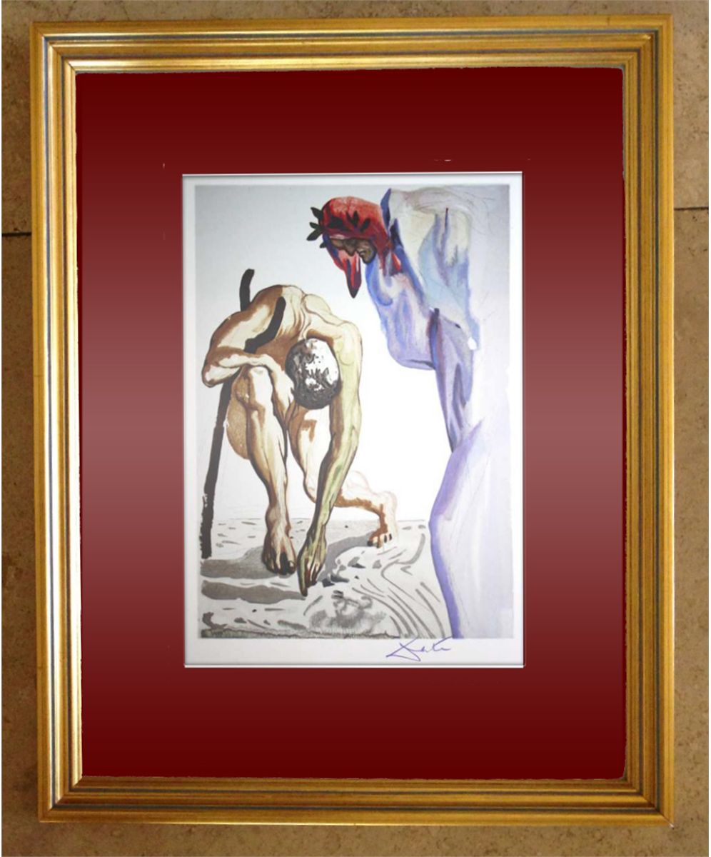 SALVADOR DALI LITHOGRAPH ON RIVES PAPER - (AFTER THE WOODBLOCK - FROM DANTE'S "LA DIVINA COMMEDIA") - MINT CONDITION - UNIQUE COLOR AND PLATE VARIATIONS - SIGNED IN THE PLATE - PROFESSIONALLY FRAMED AND MATTED - SHEET SIZE 13" X 10 1/4" - FRAMED APPX 16" X 13"
