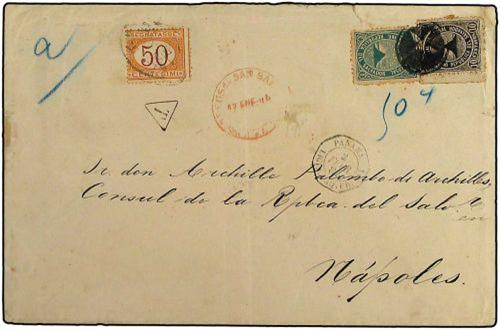 1885 S. SALVADOR a NAPOLES. 1 ctvo. verde y 10 ctvos. negro. Circulada por buque francés, fechador octogonal PANAMA/LIG. A PAQ. FR. Nº1 y tasada a la llegada con sello Italiano de 50 cent. Rarísimo franqueo. Probablemente UNICA CONOCIDA.