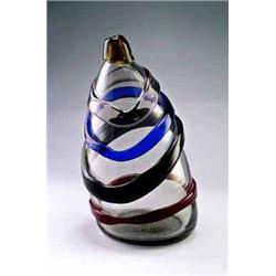 SALVIATI & CO., Murano Luciano Gaspari Vase, farbloses Glas mit umlaufend aufgelegten wulstigen Farbbändern in Opakrot, dunkelviolett, Blau und Braun. Geneigte ovoide Form mit stark eingezogener Mündung. H.: 30 cm. Bez.: Künstlersign. LUCIANO GASPARI (geritzt). Mit Firmenetikett. 1962 Lit.: Heiremans, M., Glas-Kunst aus Murano, 1910-1970, Stuttgart 1993, Abb. 121.