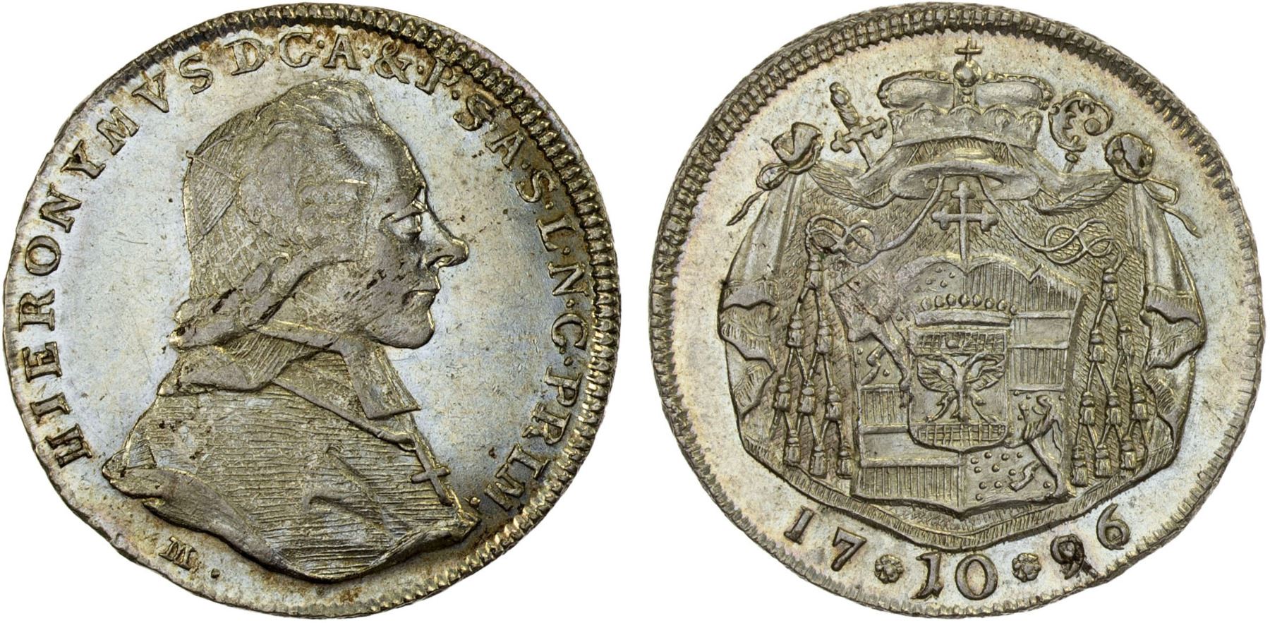 SALZBURG: Hieronymus, 1772-1803, AR 10 kreuzer, 1796, KM-464, initial M, lightly cleaned, but very attractive, Choice XF, ex Almer H. Orr III Collection.