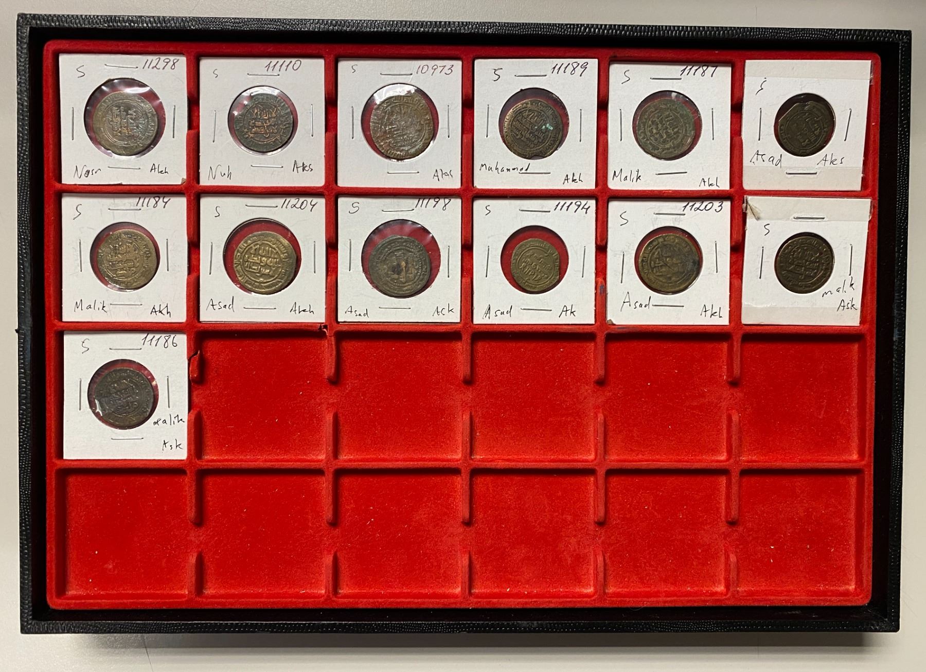 SAMANID OF AKHSIKATH: LOT of 13 copper coins, includes issue of Asad (5 pcs), Muhammad b. Asad (1), and Malik (b. Shukurtegin) (4), and two purely Samanid types (one each from Nasr II and Nuh II), and one uncertain, all from the Akhsikath mint except for the issues of Malik which are from the mint of Ferghana; average Fine condition, several with weakness or other defects; retail value $500, lot of 13 pieces.