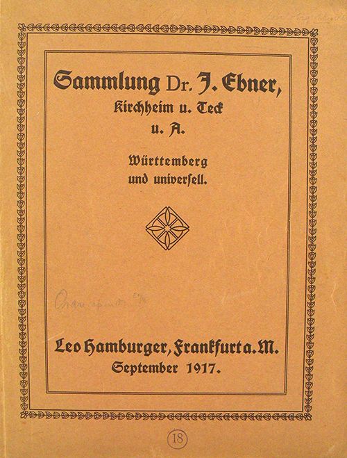 Hamburger, Leo. SAMMLUNG DES HERRN DR. J. EBNER. WÜRTTEMBERGISCHE MÜNZEN UND MEDAILLEN. UNIVERSALSAMMLUNG NAMENTLICH REICHHALTIG IN DEN SERIEN BADEN, ROTTWEIL, KUNSTMEDAILLEN. Frankfurt a.M., 4. September 1917 u. ff. Tage. 4to, original printed card covers. viii, 120 pages; 1819 lots; 15 fine plates. Spine lettered. Very good or better. An important sale. Clain-Stefanelli 9142.