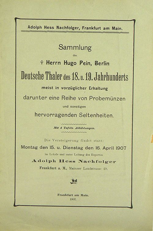 Hess. Adolph. SAMMLUNG DES HERRN HUGO PEIN, BERLIN. DEUTSCHE THALER DES 18. U. 19. JAHRHUNDERTS... Frankfurt a.M., 15.-16. April 1907. 8vo, original printed wraps. (2), 36 pages; 686 lots; 4 fine plates. Pages browned. Very good or better. Very scarce.
