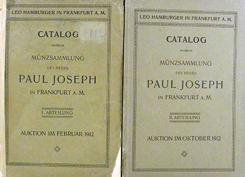 Hamburger, Leo. SAMMLUNG DES HERRN PAUL JOSEPH. I. ABTEILUNG: MÜNZEN UND MEDAILLEN VON SÜDDEUTSCHLAND UND LUXEMBOURG. II. ABTEILUNG: MÜNZEN UND MEDAILLEN VON RHEINLAND, WESTFALEN, NORDDEUTSCHLAND UND AUSSERDEUTSCHEN STAATEN. Frankfurt am Main, 26. Februar & 28. Oktober 1912 und folgende Tage. Two parts, complete. 8vo, original printed wraps. (iii)-viii, 212; (8), 208 pages; 8870 lots; 20 fine plates. First catalogue lacking title page; spine taped. Housed in portfolio boards. Very good or better. An important collection. Clain-Stefanelli 9152.