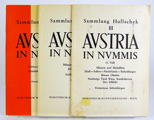 Dorotheum-Kunstabteilung. SAMMLUNG KARL HOLLSCHEK. I-III: AUSTRIA IN NUMMIS. Wien, 28.-29. Februar 1956; 22.-24. November 1956; 18.-19. Juni 1957. Three parts, all with plates. 4to, original printed card covers. Valuation lists. Third sale covers stained, else generally fine. Hollschek amassed one of the largest coin collections ever formed, comprising approximately 220,000 pieces. The three catalogues present here featured most of the important Austrian coins. Clain-Stefanelli 8312*. Grierson 273.