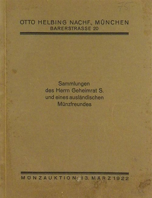 Helbing, Otto (Nachf.). SAMMLUNGEN DES HERRN GEHEIMRAT S. UND EINES AUSLÄNDISCHEN MÜNZFREUNDES. HERVORRAGENDE REIHEN VON GOLD-MÜNZEN UND GOLD-MEDAILLEN, BEDEUTENDE SERIEN VON UNGARN-SIEBENBÜRGEN... München, 13. März 1922 und folgende Tage. 4to, original printed card covers. (2), 171, (5) pages; 2738 lots; 42 plates. Near fine. Another scarce sale.