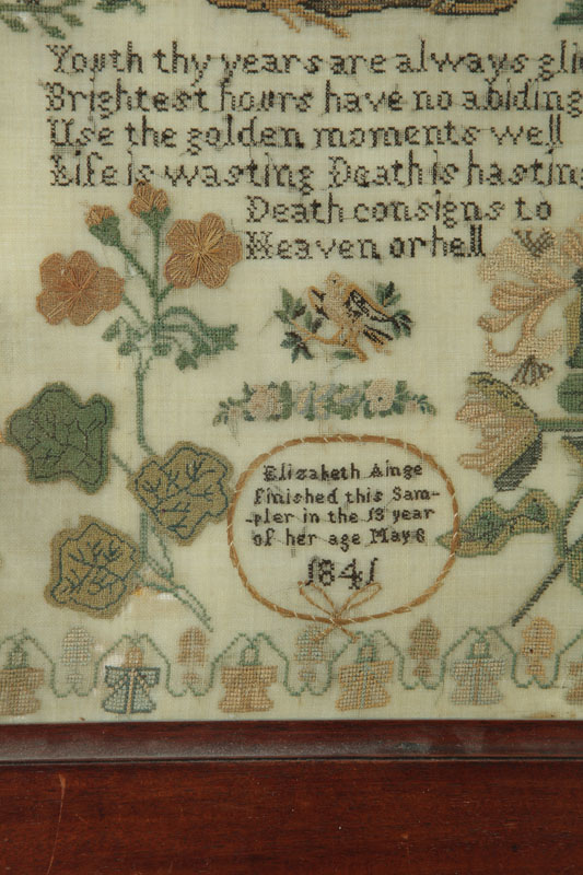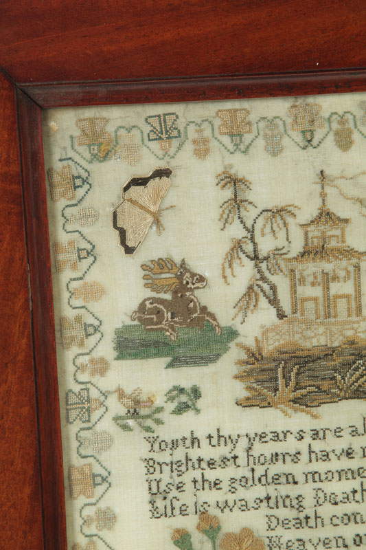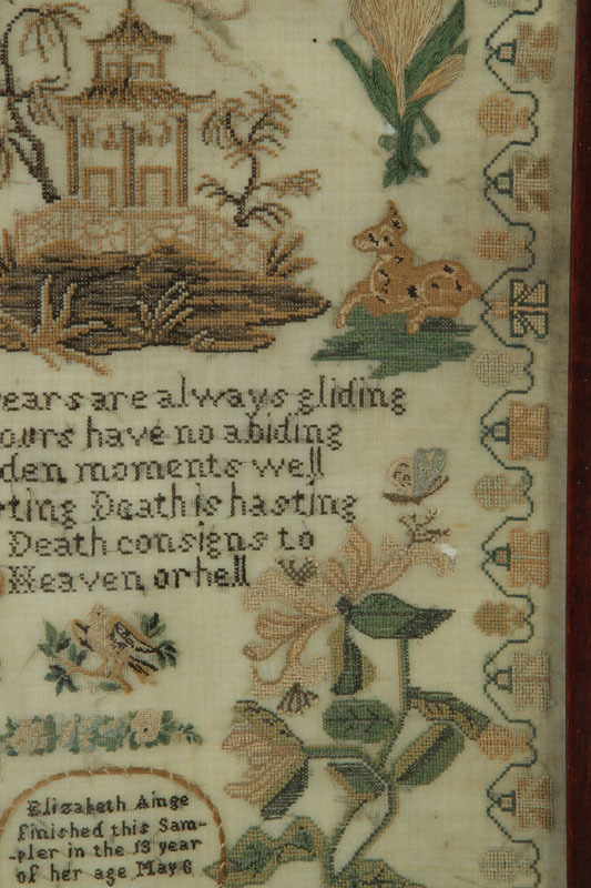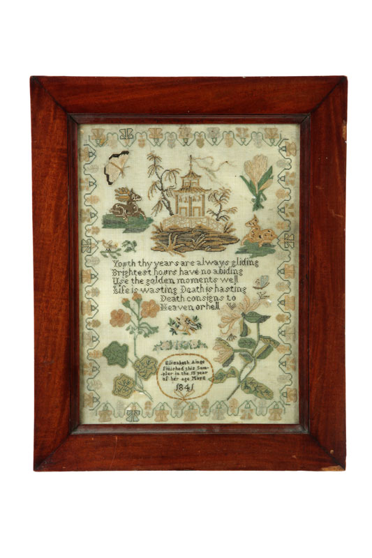Elizabeth Ainge, English,1841, silk on wool. Minutely worked motifs include an Oriental-style building, a pair of recumbent deer and butterflies, as well as flowers and birds. Signed and dated. In a frame, 21"h. 16 1/2"w.