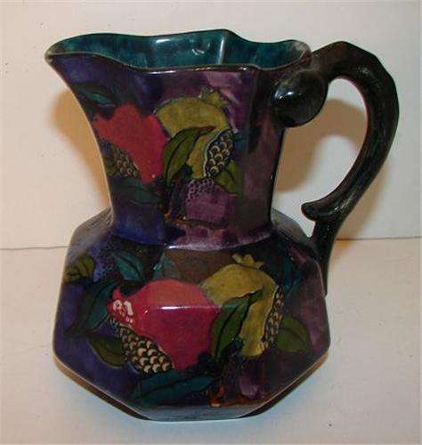 SAMPSON HANCOCK POMEGRANATE PATTERN PORCELAIN CREAMER. Marked on bottom “Rubeno Ware/S. Hancock & Sons/Stoke-on-Trent/England/Pomegranate/Hand Painted”. 5” H