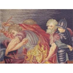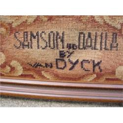 Large framed 19th century needlework entitled "Samson and Dalila" after a painting by Baroque artist Anton Van Dyck. Elaborate foliate border surrounding scene of great angst. Some incredibly fine petit point stitching in flesh of the 7 figures. The jewelry embroidered with silk thread. Molded walnut frame with impressed pattern. Overall size - 43-3/4" tall and 60-3/4" wide.