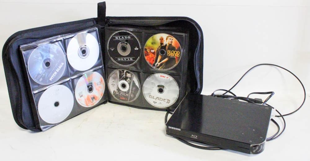 SAMSUNG DVD PLAYER & BINDER OF 128 MOVIES