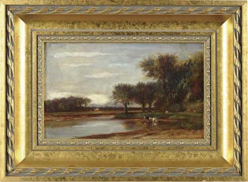 SAMUEL COLMAN (American, 1832-1920) THE INTERVALE. Oil on board landscape scene shows two cows in foreground on wide stream with two figures on grassy bank. Hay wagon is seen on other bank and trees surround the scene under blue and purple sky. Signed lower right "Sam'l Colman". Housed in a gilt molded wood modern frame. SIZE: 6-1/2" x 10-1/2". CONDITION: Evidence of a crease in the board at back of cows. Generally very good. 9-27136
