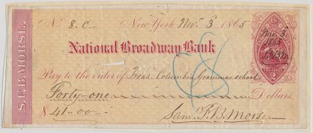 (1791 - 1872) American inventor credited with the invention of the telegraph, as well as a signaling alphabet known as the Morse Code. Rare D.S. "Sam. F. B. Morse", 1p. 7 3/4" x 3 1/4", New York, Nov. 3, 1865, his personal check with imprinted name made out in his hand and making a $41.00 payment to "Treas. Columbia Grammar school", with internal Revenue stamp also initialed by him. Cut-cancel and blue pencil docket do not affect signature, tipped to part of an album page.