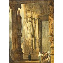 Säulenarchitektur im Eingang einer gotischen Kirche. Aquarell mit Deckweißhöhung. - <U>Monogrammiert</U>. Auf Vélin. Größe: 30 x 22 cm. Schwach gebräunt. Fein ausgeführte Arbeit in der Art seines Vaters und Lehrers Samuel Prout. Gerahmt.