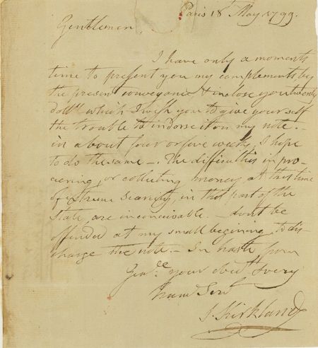 (1741 - 1808) A Presbyterian missionary among the Oneida and Tuscarora people in North America. He was the founder (in 1793) of the Hamilton-Oneida Academy (later Hamilton College). He became an advisor and ambassador for the Iroquois during the Revolution persuaded many Oneidas and Tuscaroras to assist the American revolutionaries. After the war, he maintained good relations with the Indians and helped negotiate treaties and keep peace between Indians and whites. Rare A.L.S., 1p. 4to., Paris, Oneida Co., N.Y. , May 18, 1799. The missionary conveys his correspondent twenty dollars in the form of a draft, adding: "...The difficulties in procuring, or collecting money at this time of extreme scarcity in this part of the state, are inconceivable. Don't be offended at my small beginning, to discharge the note...". Small binding strip at verso of left margin, repaired seal tear at top margin, else very good.