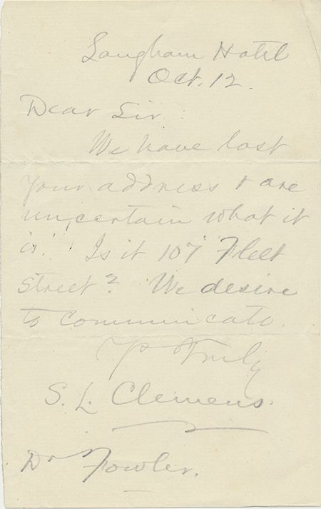 (1835 - 1910) "Mark Twain", American author of such classics as The Adventures of Tom Sawyer, Huckleberry Finn, and A Connecticut Yankee in King Arthur's Court. A.L.S. 1p. 8vo., Oct. 12, [n.y.], in pencil to Dr. Fowler, in part: "...We have lost your address & are uncertain what it is. Is it 107 Fleet Street? We desire to communicate...". Folds, very good.