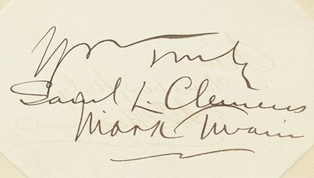 (1835 - 1910) "Mark Twain", American author of such classics as The Adventures of Tom Sawyer, Huckleberry Finn, and A Connecticut Yankee in King Arthur's Court. Fine, bold double signature on a card: "Yrs truly Saml L. Clemens Mark Twain". Fine.