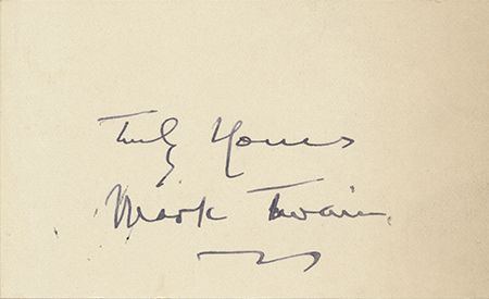 (1835 - 1910) "Mark Twain", American author of such classics as The Adventures of Tom Sawyer, Huckleberry Finn, and A Connecticut Yankee in King Arthur's Court. Bold signature and closing on a small card: "Truly yours Mark Twain". Mounting traces to verso, very good condition and ideal for display.