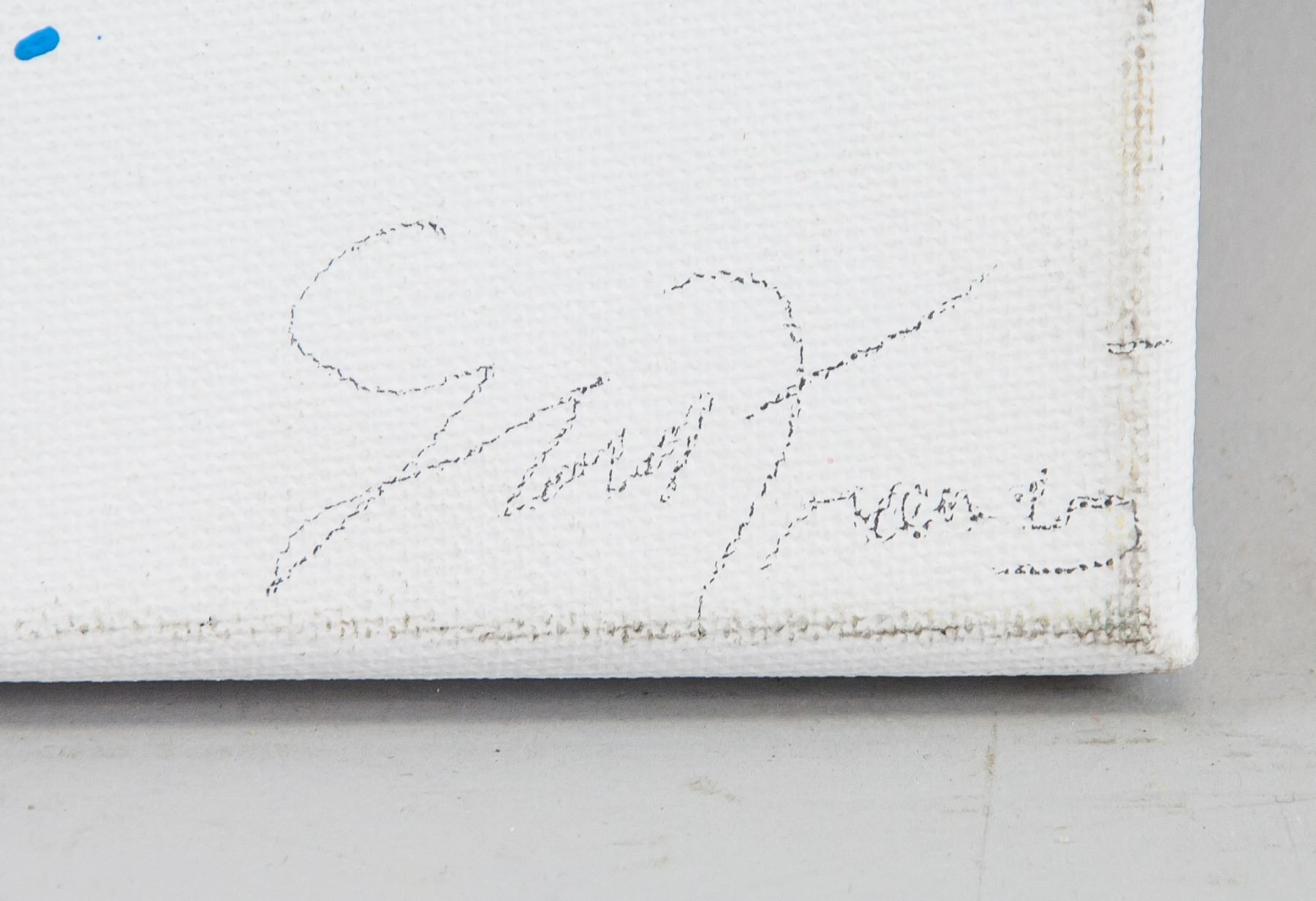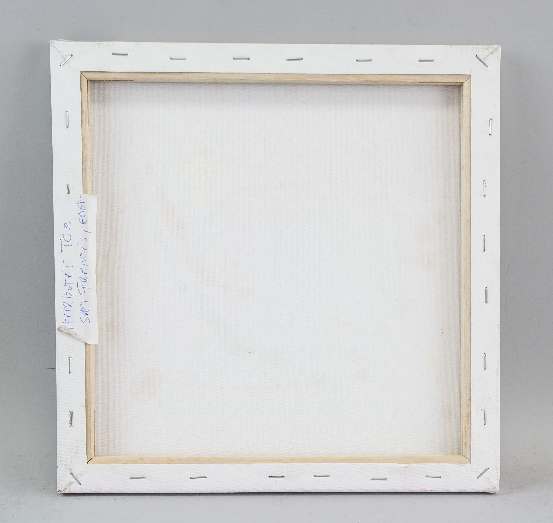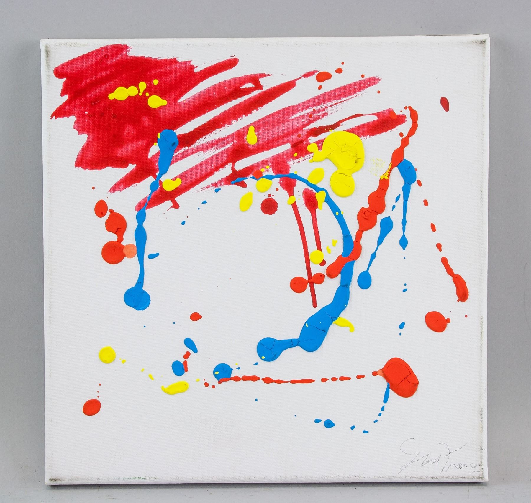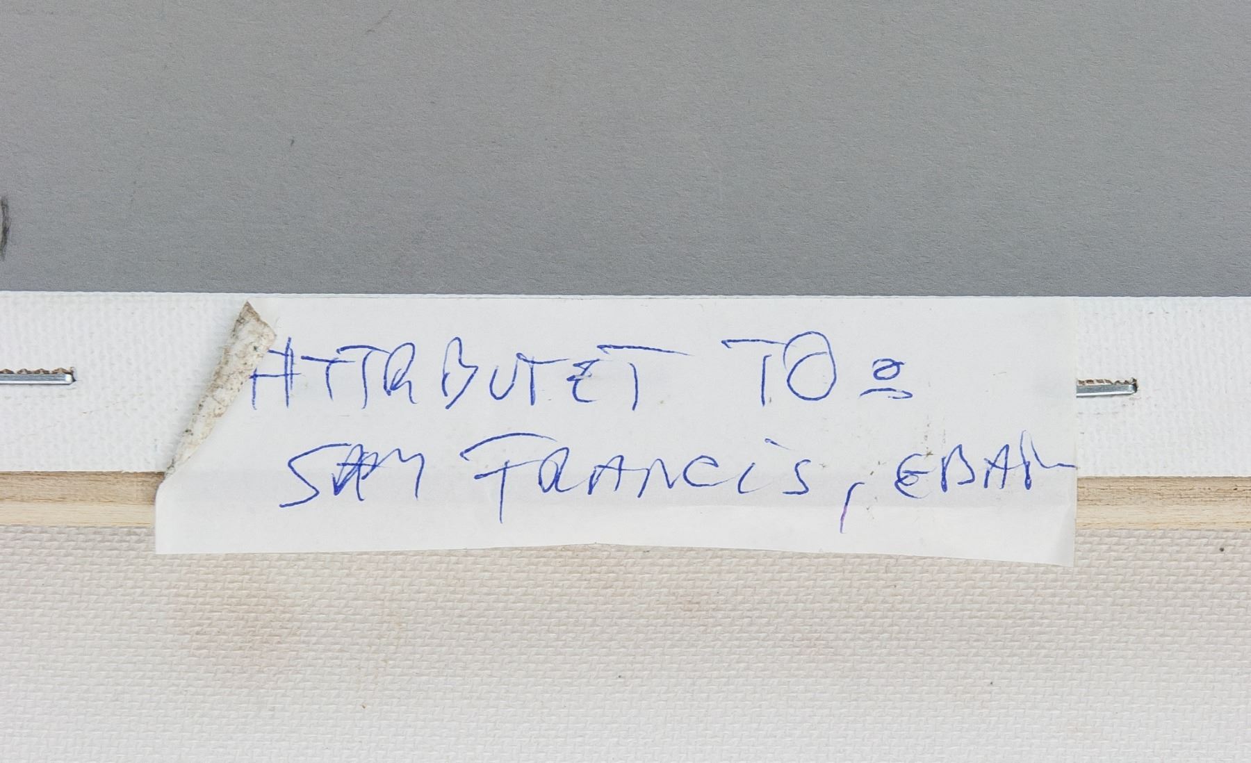 Acrylic on canvas. Abstract composition. Signed and attr. Sam Francis (American, 1923-1994). 12 x 12 in. (30.5 x 30.5 cm). The painterly abstraction of Sam Francis is most often associated with the American Abstract Expressionist movement, but Francis also spent a great deal of time in Paris and became linked with the parallel movement of Art Informel in Europe. Francis’ most iconic works are characterized by saturated splashes of color that populate the edges of the canvas in order to emphasize the luminous white void in the center. This contrast between the vibrancy of Francis’ color palette and the austere white picture plane demonstrate the artist’s concern with relationships of space, color, and light, as opposed to the psychologically expressive tendencies of contemporaries such as Jackson Pollock.