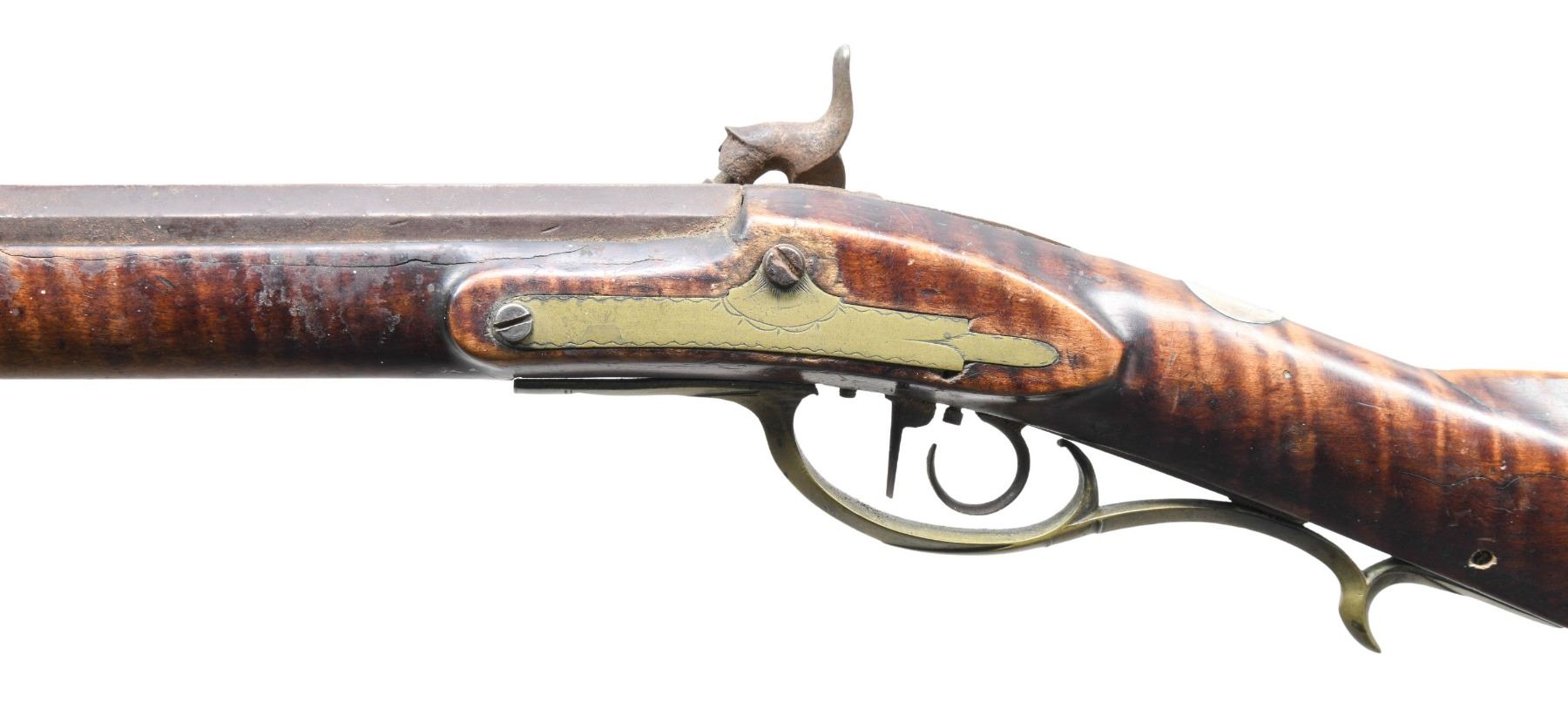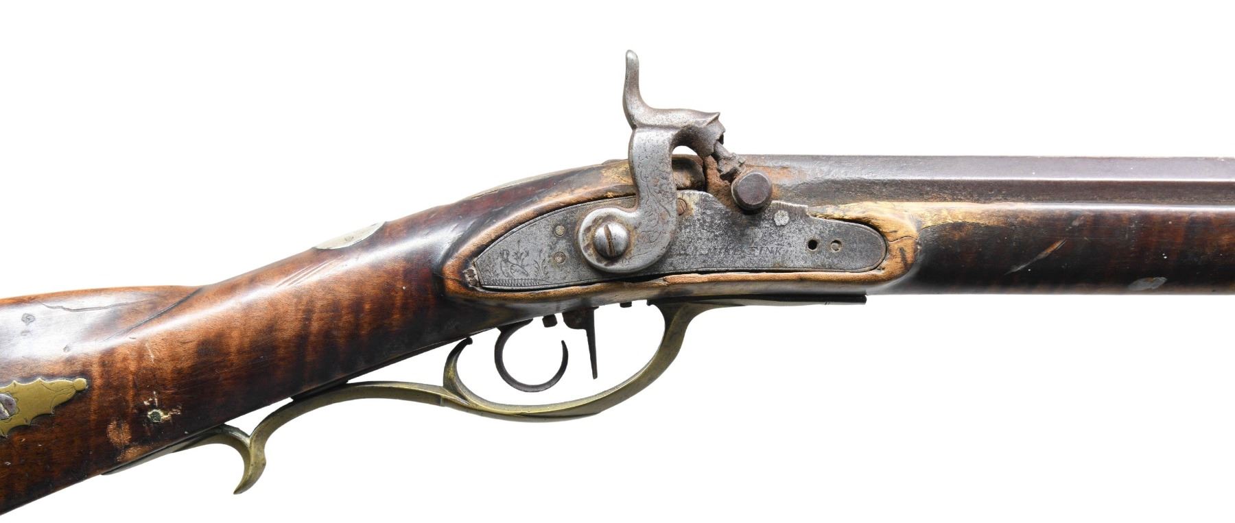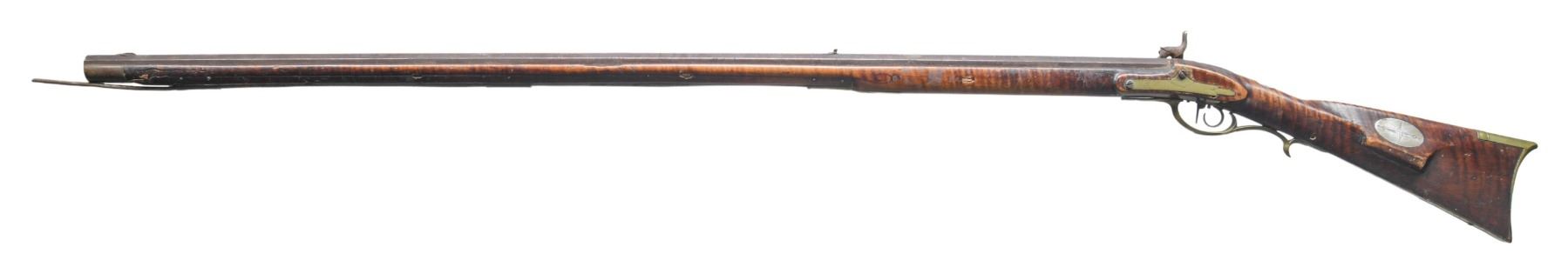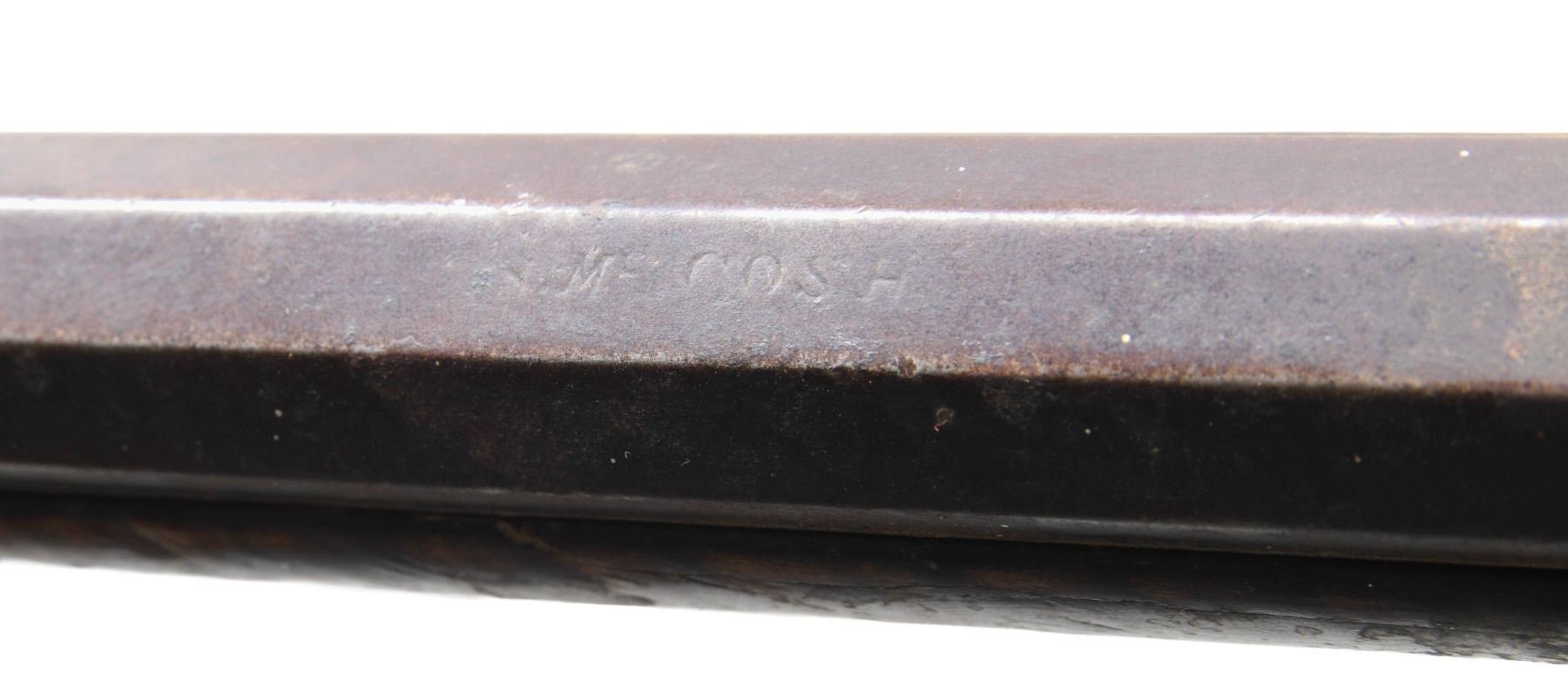 Cal. 38. NSN. Bbl. 42 7/8" octagon measuring 7/8" across flats at the muzzle. Dovetail mounted German silver blade front sight with fixed V-notch rear sight mounted 2 1/2" forward of an additional dovetail with a brass filler. Top flat has builders marking "S. Mc Cosh". Samuel McCosh was born in 1813 in Nottingham Township, Washington County, PA. He worked from 1835-1890, first in Pittsburg and later in Gastonville, PA. French side lug style percussion conversion. Engraved trade lock and hammer. Lock plate is marked "MIKE FINK". Double set triggers, rear trigger has a 3/4" curl. Full length wedge fastened curly maple Roman nose cheekpiece stock. Right side has lightly engraved pierced and segmented rectangular lid brass patchbox. Additional brass fittings include finger curl trigger guard, sideplate, crescent buttplate, toeplate, and nose cap. Cheekpiece is adorned with a German silver oval with starburst engraving. Additional German silver ornamentation is an oval wrist plate. Ramrod channel of stock and left wrist have incised carved highlights. Replacement wire ramrod held by brass thimble and 2 pipes. Weight: 9lbs. 7.4oz. UNATTACHED ACCESORIES: several pages of printed information from Wikipedia about the historical river boatman Mike Fink. Fink 1770/1780's -1823 was born near present day Pittsburgh. He was known as the "King of the keelboaters" for his legendary exploits on the Ohio & Mississippi rivers. Also included is a notarized letter from the consignor about finding thid rifle and a pistol in his grandfather's attic. CONDITION: bbl. has a faded brown appearance showing marks, small dents & spots of corrosion, with pitting becoming heavy in the breech area. Lock and hammer have a cleaned gray appearance showing spots of pitting. Hammer is chipped. Lock will not hold in full cock position. Trigger is not setting properly. Stock has worn appearance with numerous scratches, marks, and dents having cracks along the forearm channel with areas of missing wood in lock and top tang areas. All four wedges are crude iron replacements. Upper pierced portion of the brass patchbox is missing. Some patchbox screws are replacements. Dark pitted bore. (01-27182/DS). ANTIQUE. $3,500-5,000.