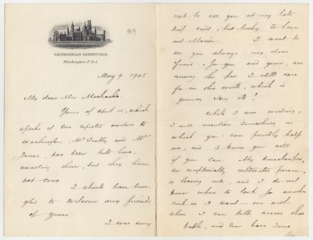 (1834 - 1906) American aviation pioneer who explored the possibility of flight by heavier-than-air machines and actually succeeded in inventing such a machine which flew over the Potomac for 3,000 feet. A.L.S. 3pp. 8vo., Washington, May 9, 1905, on Smithsonian Institute letterhead to Mrs. Michaelis, wife of Capt. Otho Michaelis of the U. S. Signal Corps. In part: "...Yours of April 15, which speaks of two expected visitors to Washington, Mr. Scully and Mr. Jones, has been held here awaiting them...I should have been glad to welcome any friends of yours. I was sorry not to see you at my late brief visit..." and more social content. Very good condition.
