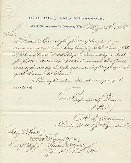 (1812 - 1897) Union rear admiral and a relative of Robert E. Lee, he commanded various blockading squadrons and was active at Vicksburg. A fine war-date L.S. as Acting Rear Admiral on "US Flag Ship Minnesota, off Newport News, Va." letterhead, 1pp. 4to., May 25, 1863, addressed to Acting Master Gregory, USS Western World. In part: "...I returned herewith for full explanations a communication from Acting Ensign John Ross of the 'Western World'...submitting a bill for fifteen dollars ($15) which amount, he asserts was expended by him for subsistence of the prize crew of the Schooner 'A. Carson'...". Fine. On April 24, 1863 the USS Western World and the USS Samuel Rotan captured the Carson along with the British schooner Martha Ann off Horn Harbor, Virginia.