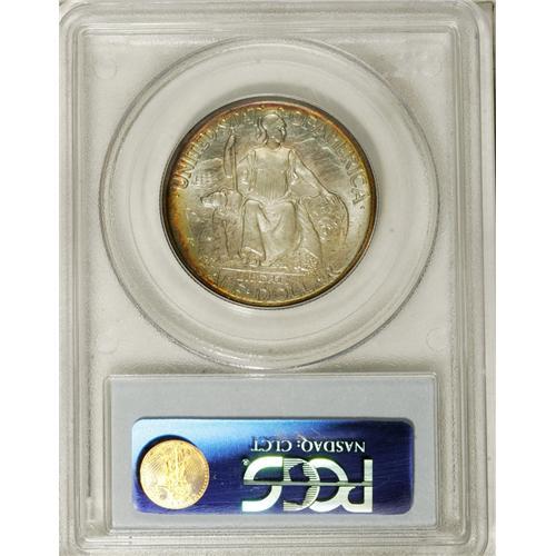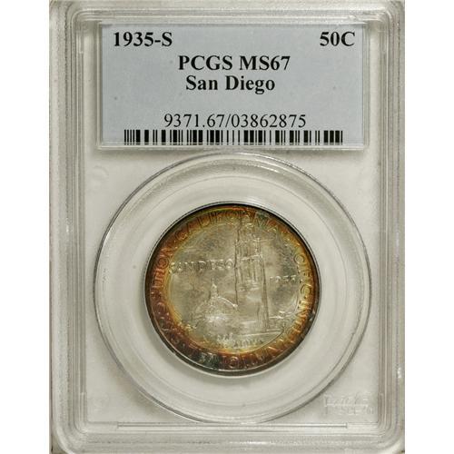 <B>1935-S 50C San Diego MS67 PCGS.</B></I> The bear that represents California on its state flag and seal makes an appearance at the feet of Minerva on this San Diego half. Orange, pink, and green-gray toning graces the rims, while the centers are silver-gray with powerful luster. PCGS has certified only three finer pieces (4/07).<BR><I>From The Cary & Cheryl Porter Collection.</B></I><BR><BR><b>Shipping:</b> Coins & Currency (<a target="_blank" href="http://www.heritageauctions.com/common/shipping.php">view shipping information</a>)