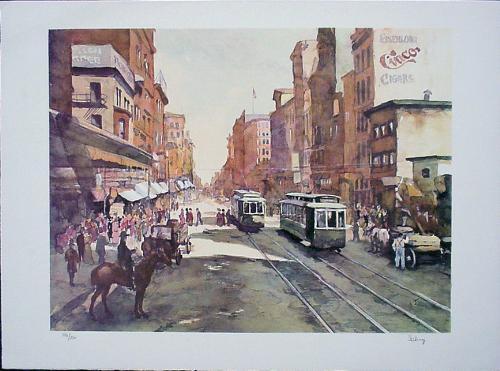Although it came to us with the title "San Francisco" street cars or trolleys were ubiquitous in most major North American cities at the turn of the century, so we can't be sure of that either. What we can be sure of, however, is that this is a very fine print of a beautifully executed and complicated watercolor painting of a lively urban scene that deserves to be appropriately framed and enjoyed!
