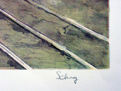 This lively San Francisco street scene is signed "Schrag" in the LR corner. The style and subject isn't at all like the work of noted artist Karl Schrag, but the signature, starting with the distinctive and bold S, is certainly very close. We wish we knew more!