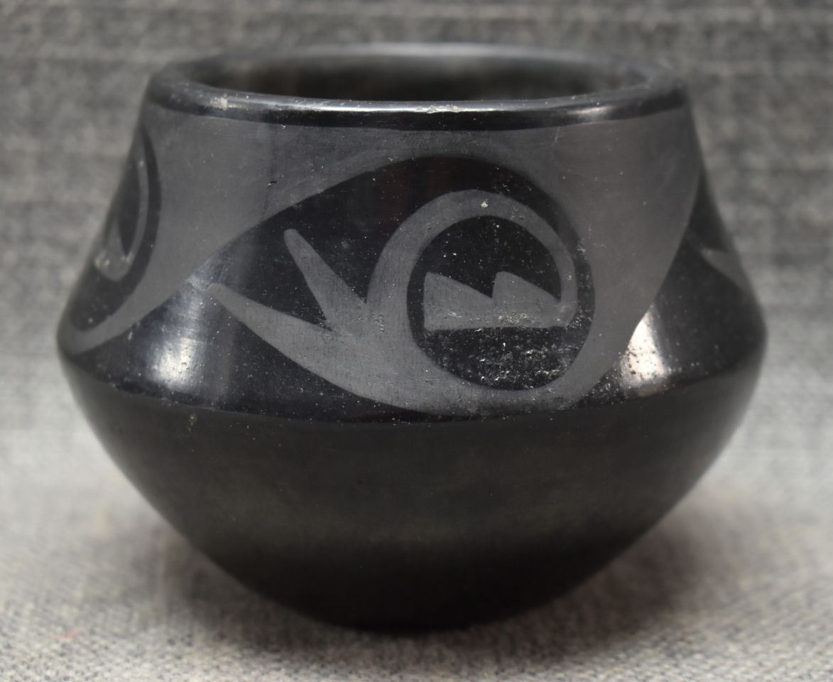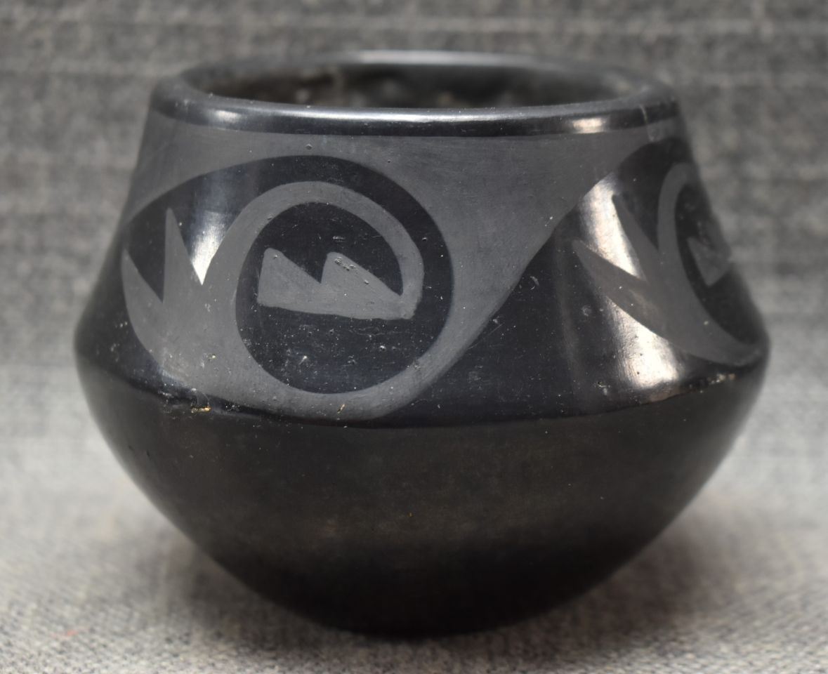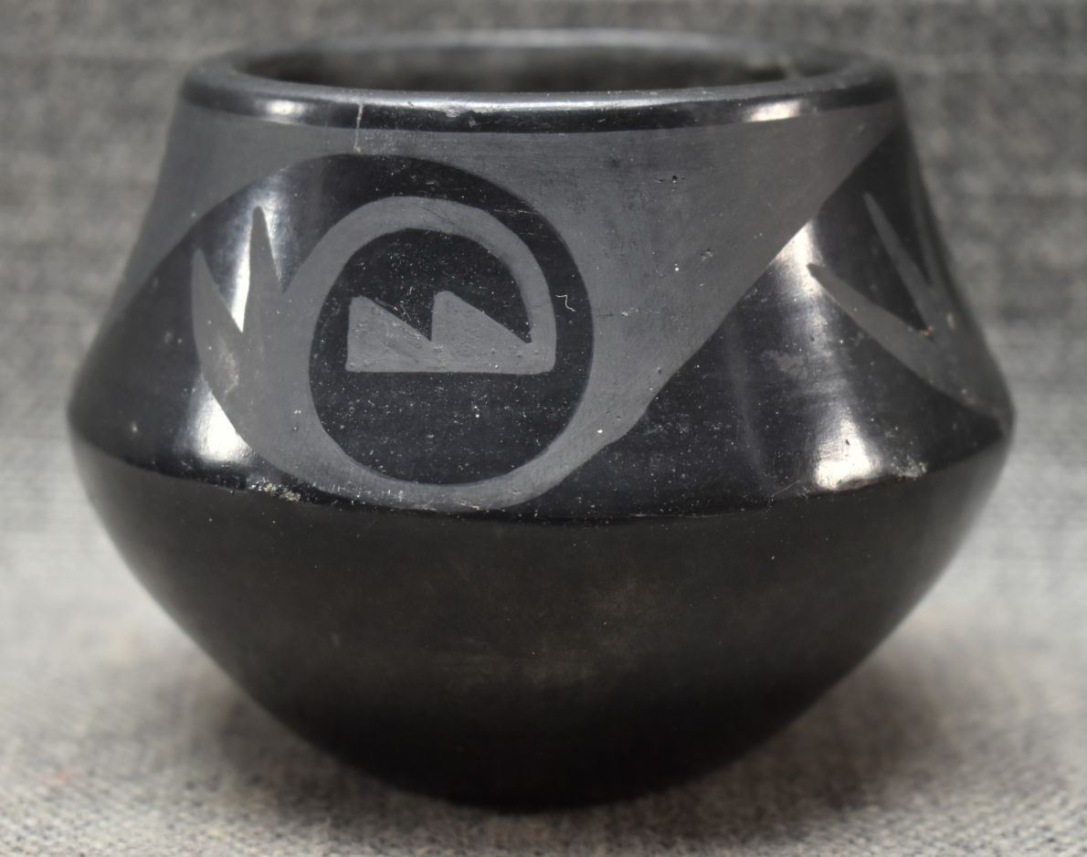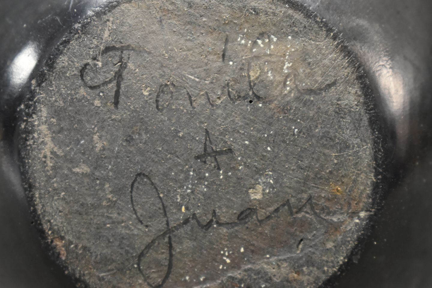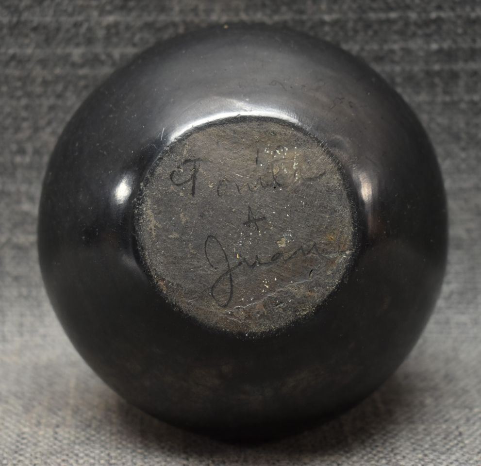 1930's San Ildefonso, hand coiled and painted pottery jar signed Tonita & Juan. 3'' x 5''