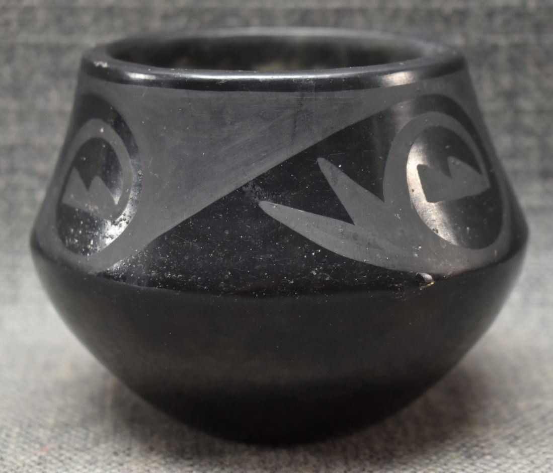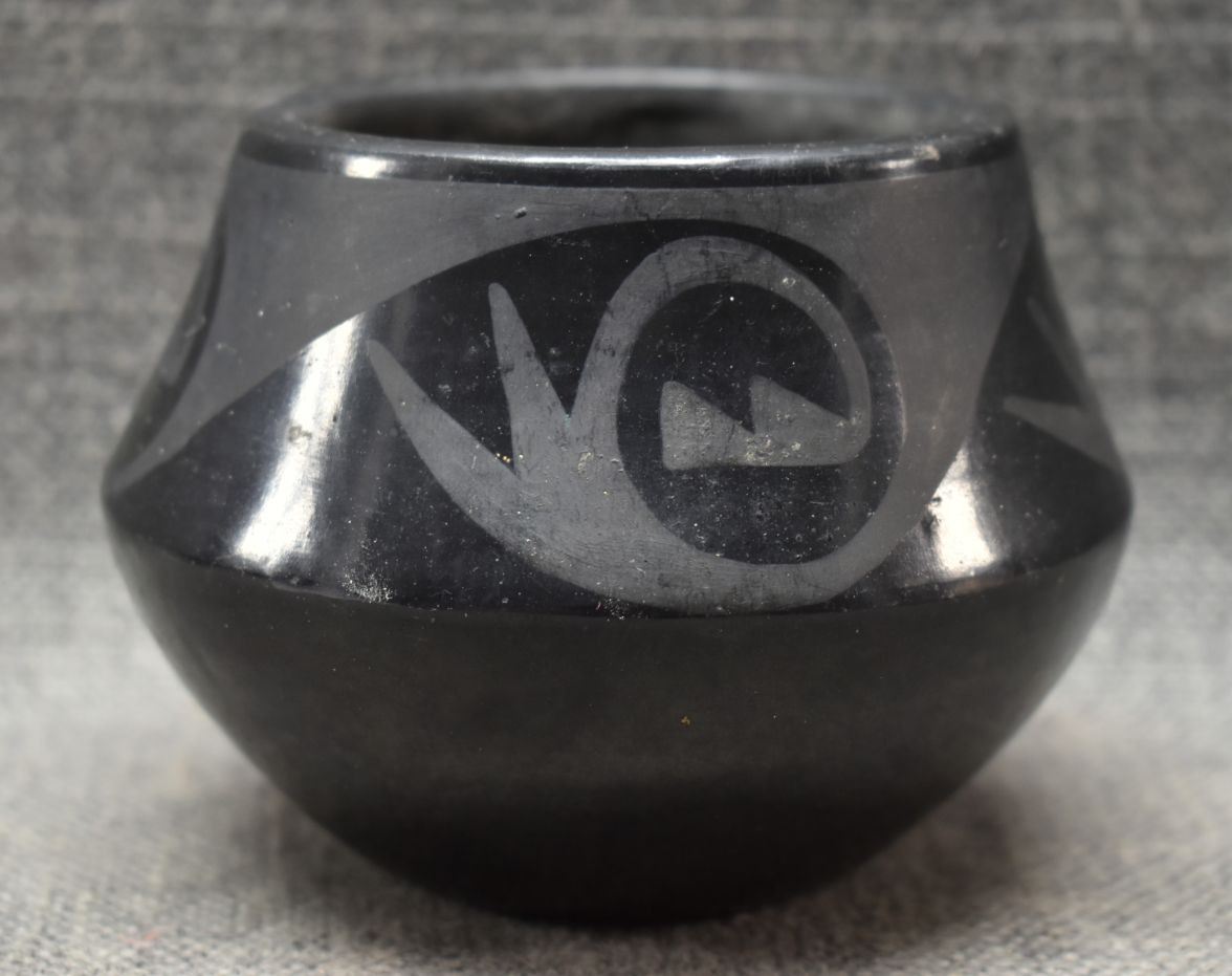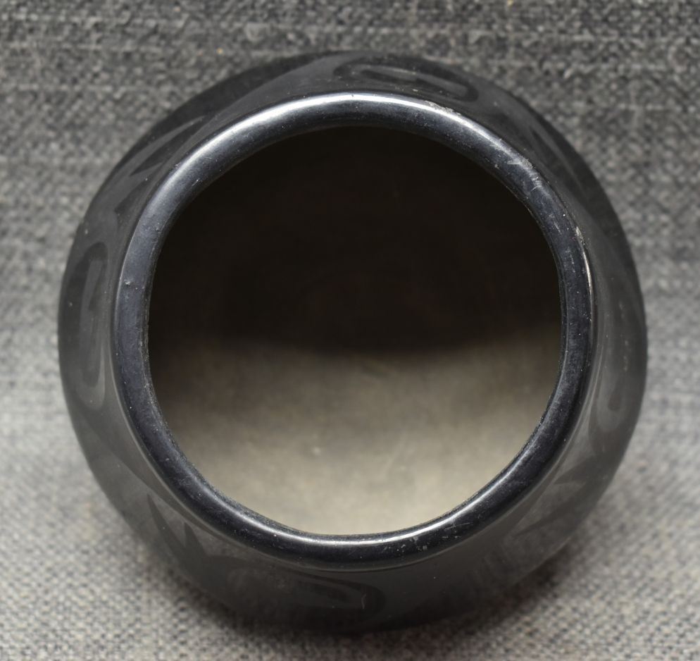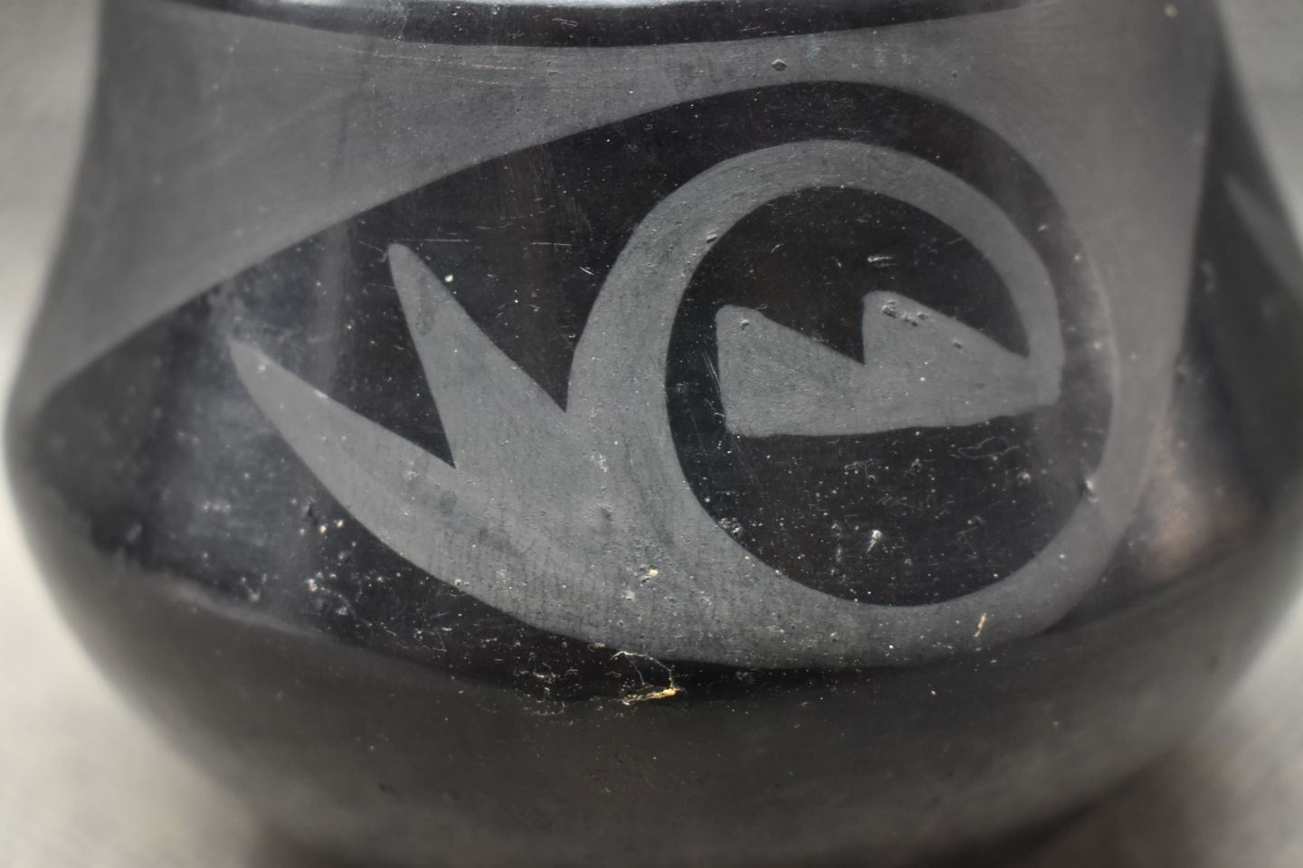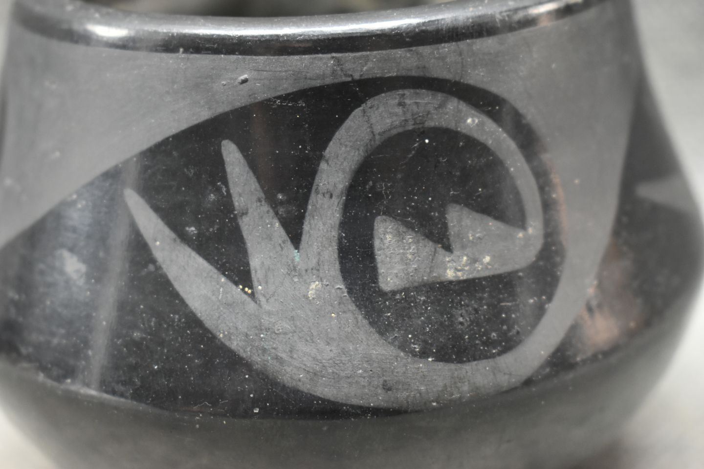 1930's San Ildefonso, hand coiled and painted pottery jar signed Tonita & Juan. 3'' x 5''