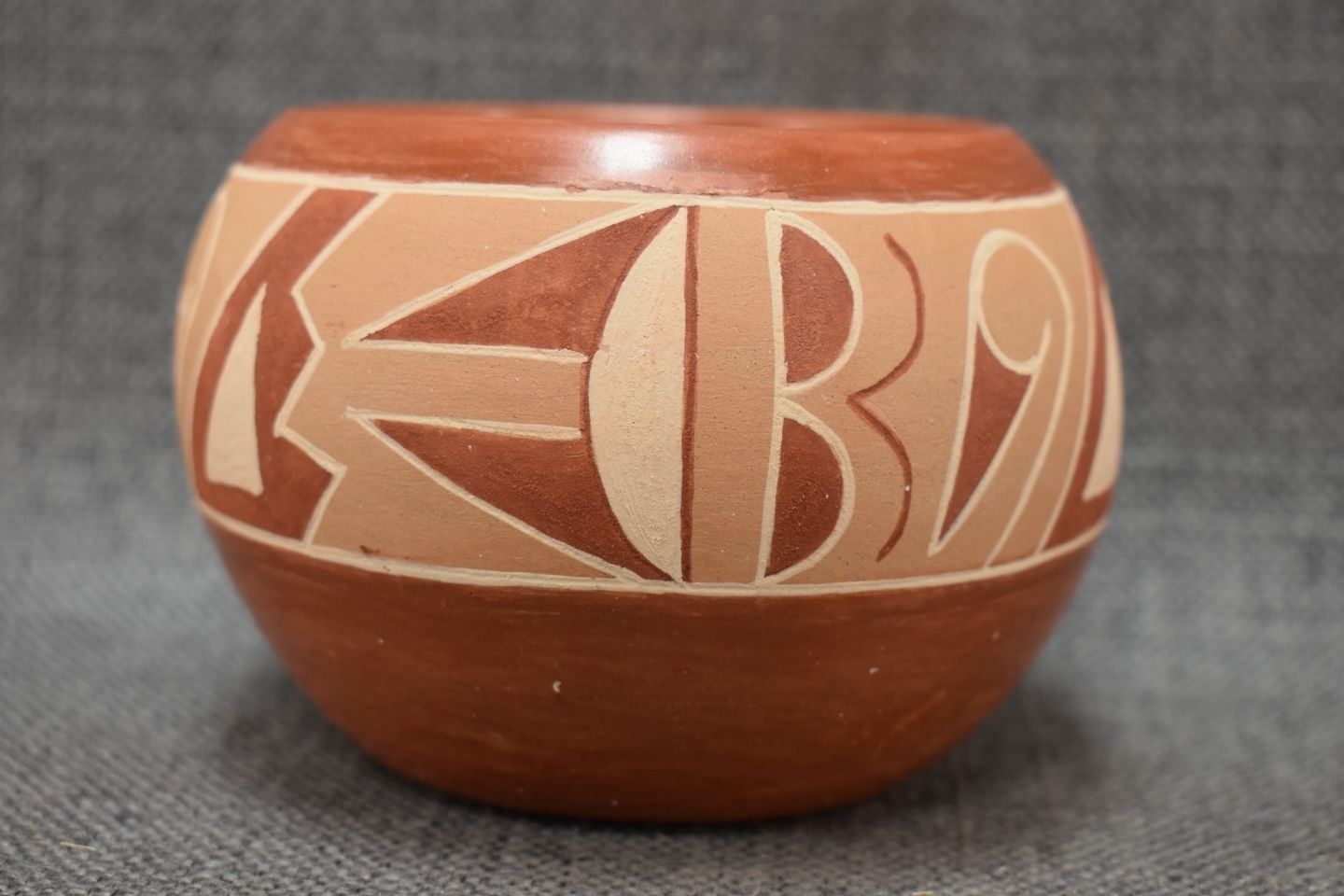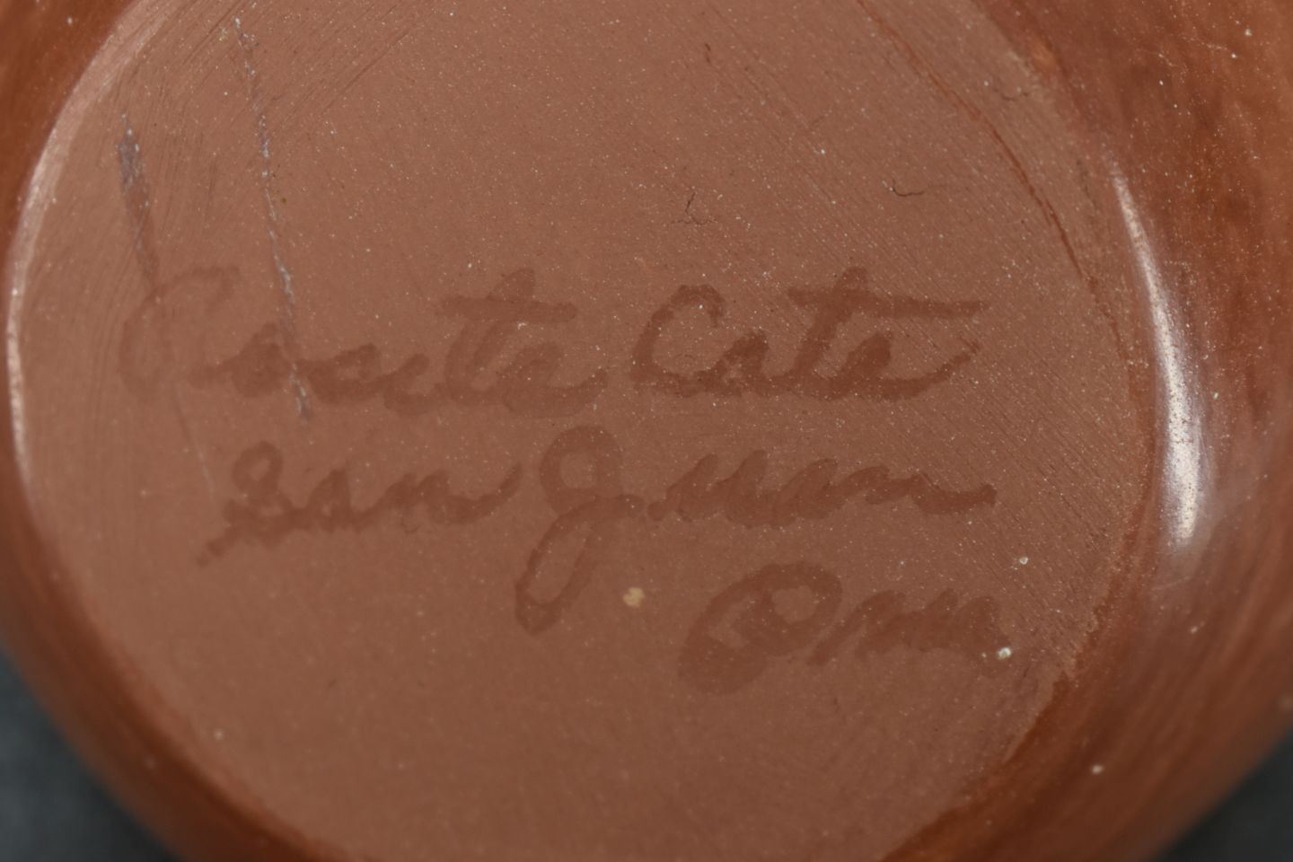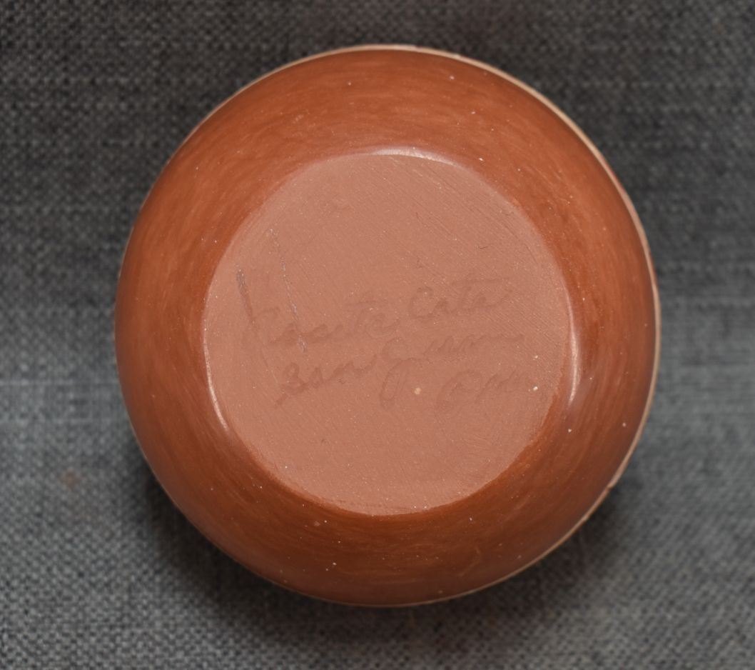 1970-80's San Juan Indian hand coiled and polychrome painted design signed Rosita Cata 3.5" x 4.5"