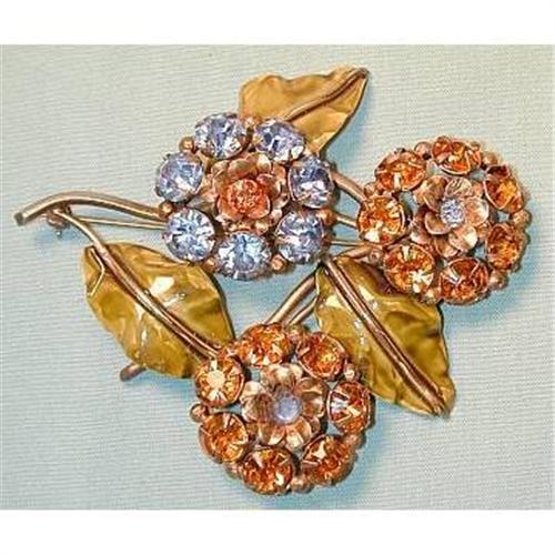 From Sandor a classic brooch featuring vermeil Sterling with enamel and rhinestones. The brooch measures 3" wide and 3" tall. It is marked Sterling, Sandor. There is no enamel loss and no missing stones. There are two center stones that are a bit dark