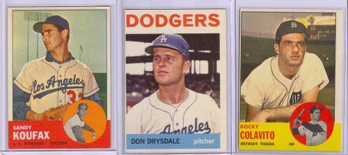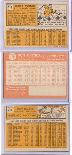 SANDY KOUFAX, DON DRYSDALE, & ROCKY COLAVITO BASEBALL CARDS. Consists of one Sandy Koufax 1963 Topps baseball card. #210. Ungraded. Consists of one Don Drysdale 1964 Topps baseball card. #120. Ungraded. Also consists of one Rocky Colavito 1963 Topps baseball card. #240. Ungraded.