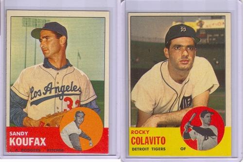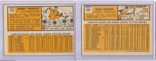 SANDY KOUFAX & ROCKY COLAVITO BASEBALL CARDS. Consists of one Sandy Koufax 1963 Topps baseball card. #210. Ungraded. Also consists of one Rocky Colavito 1963 Topps baseball card. #240. Ungraded.