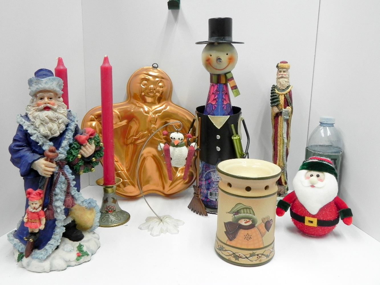 SANTA AND SNOWMAN DECOR LOT PLUS COPPER MOLD HANGING DECOR. LARGE SANTA IS 12 INCHES AND THE BOTTLE SNOWMAN IS 15 INCHES
