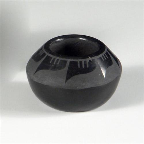 POTTERY: A small Santa Clara black pottery vessel, etched tone-on-tone black, curved shoulder, signed, ''Reycita, Santa Clara, Pue (sic)'', 2''H x 3'' diameter, a small notch to rim noted.