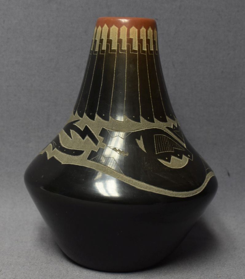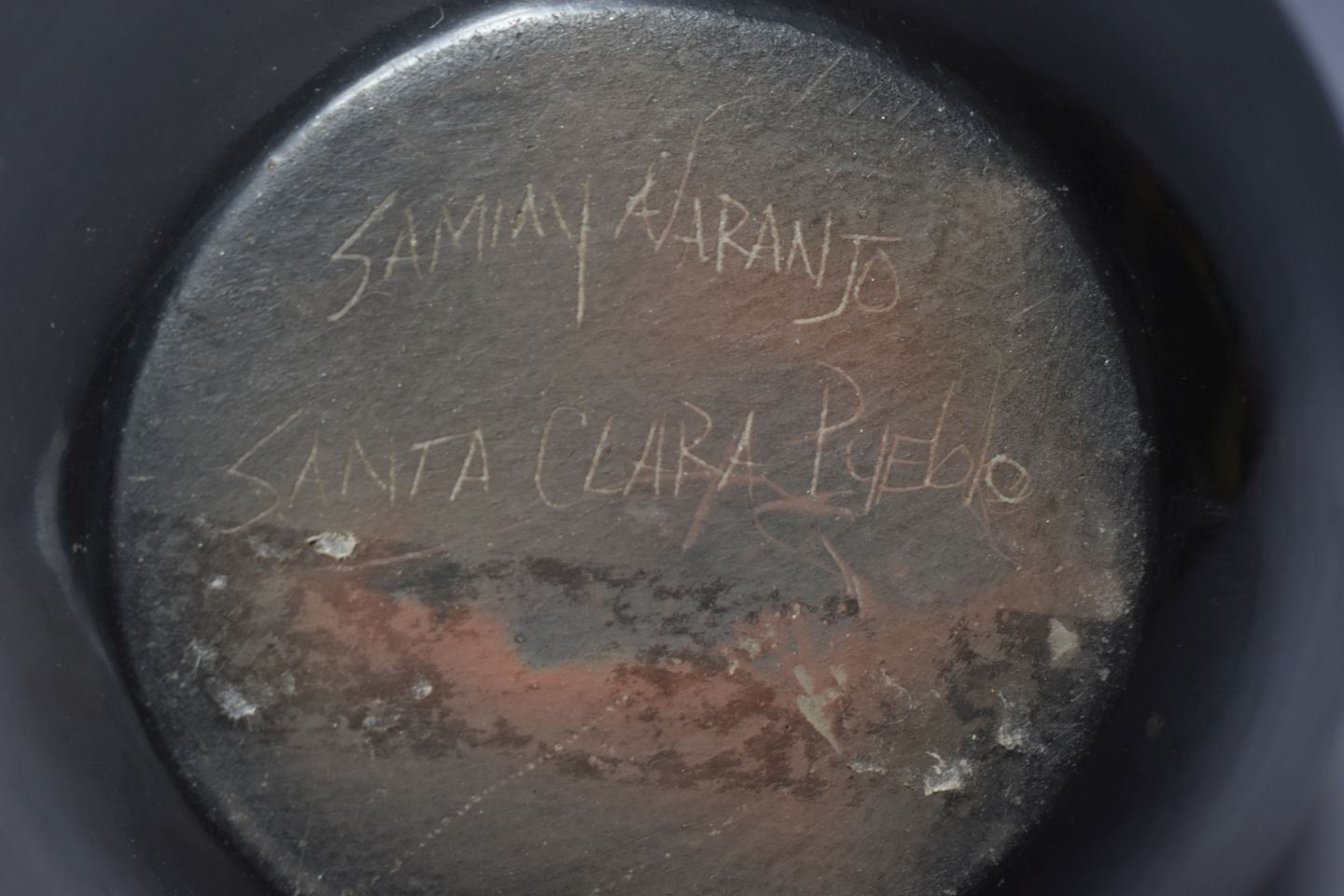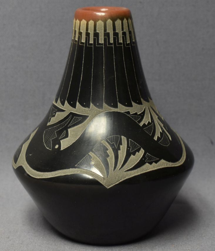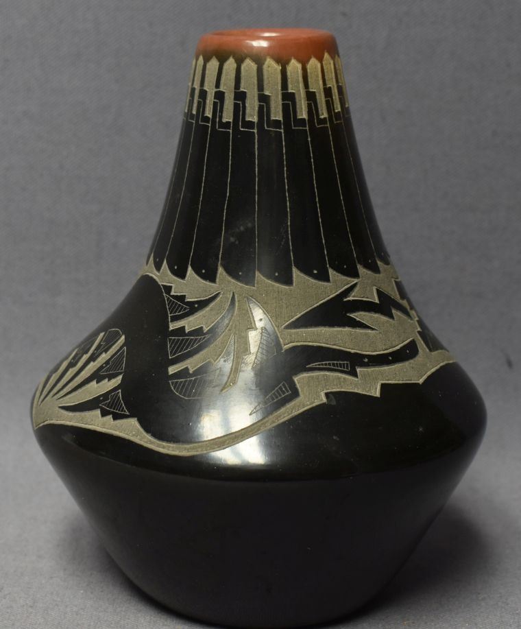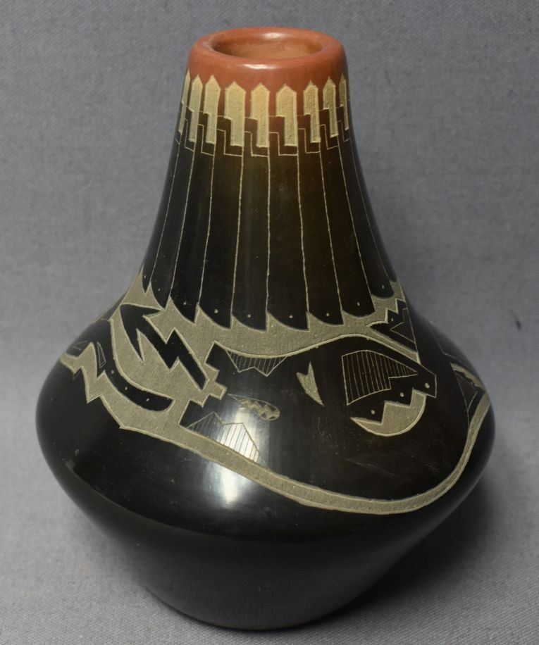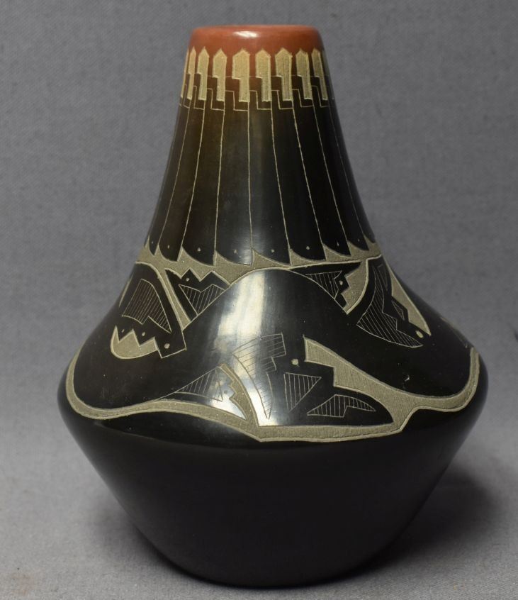1990's Santa Clara Indian. Hand coiled and busy sgraffito design pottery vase. Signed Sammy Naranjo. 7'' x 5.5''