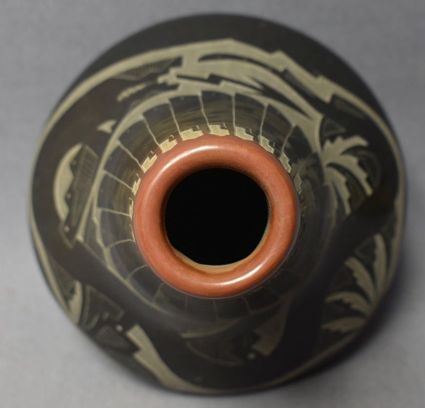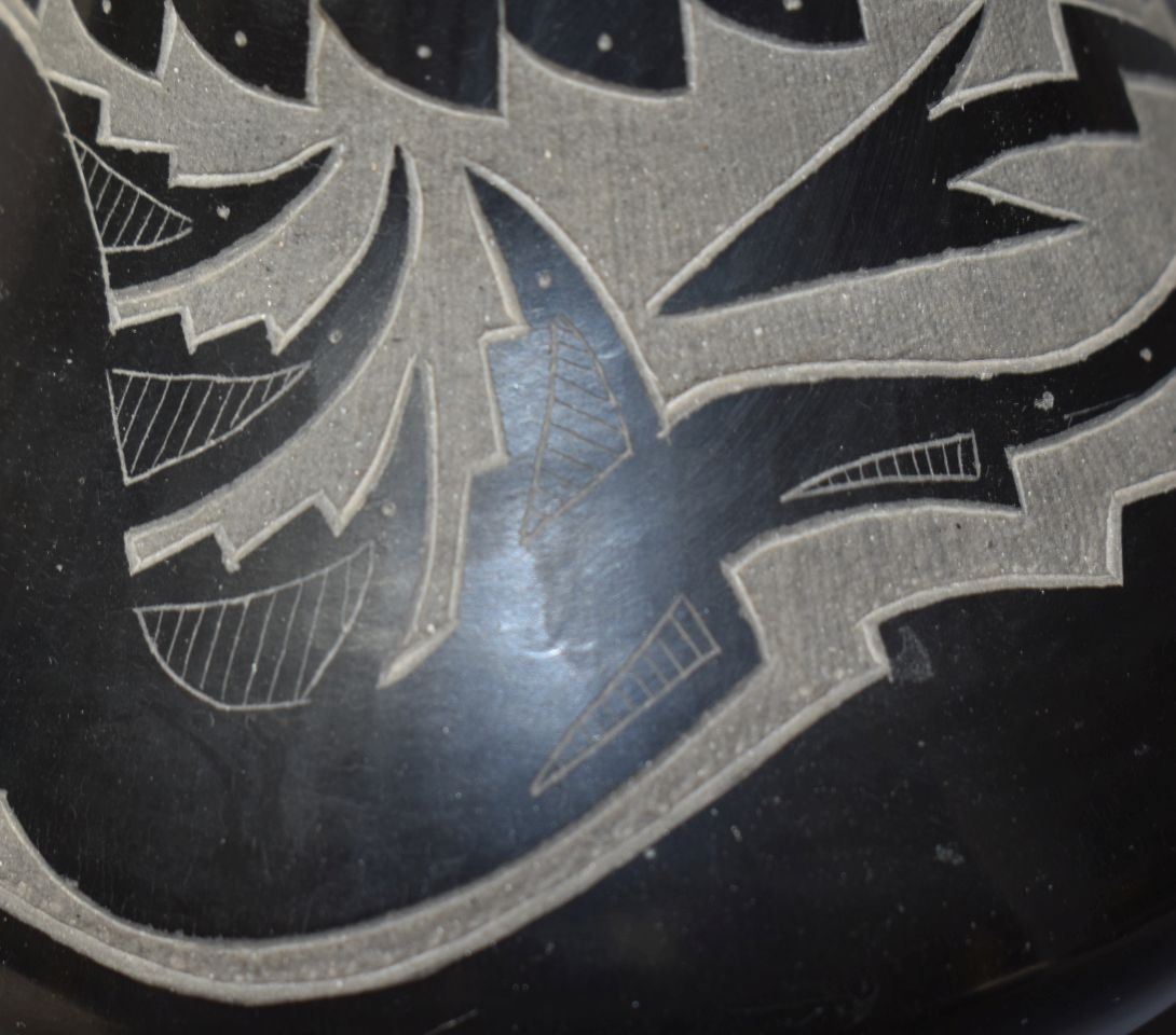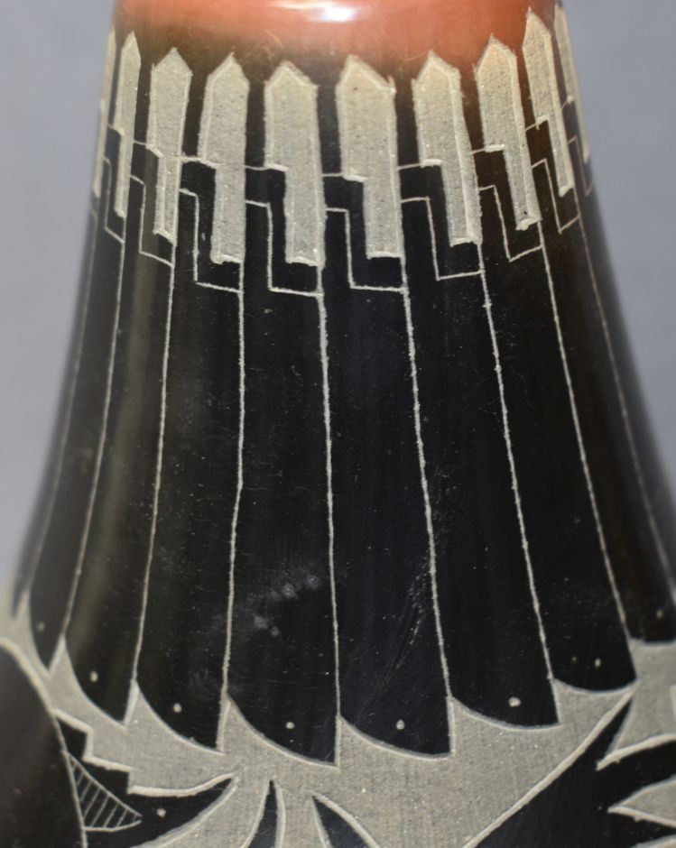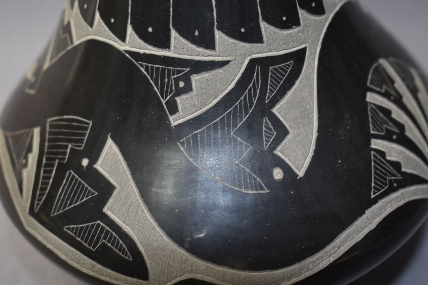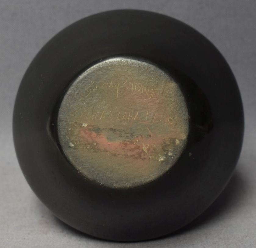 1990's Santa Clara Indian. Hand coiled and busy sgraffito design pottery vase. Signed Sammy Naranjo. 7'' x 5.5''
