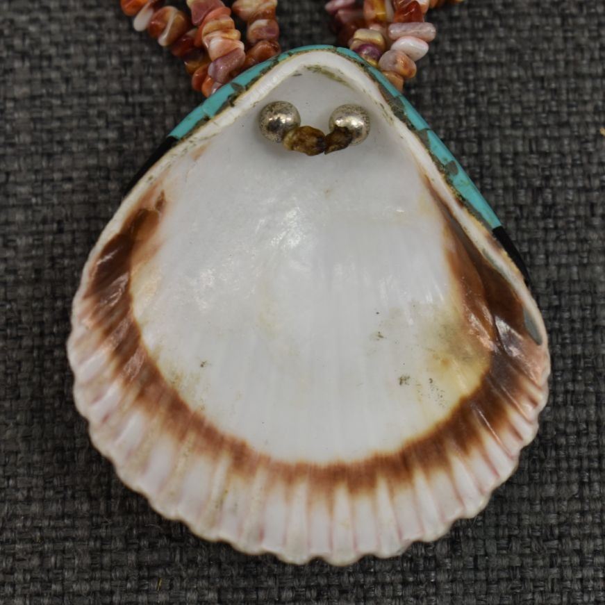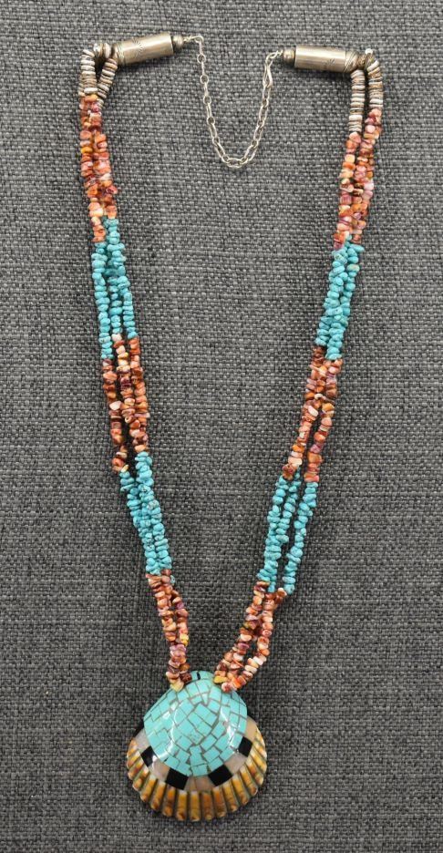 1980-90's Santo Domingo, sterling silver ends and chain with multiple strands of heishi shell and turquoise 26" long with overlaid shell pendant with turquoise shell and Jett 2.25" x 2.25" signed JDC for James and Doris Coriz