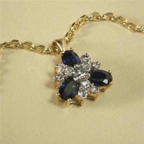 PENDANT WITH CHAIN: Elegant 14k yellow gold pendant set with three oval cut sapphires, accented with ten round cut diamonds on a chain. The sapphires measure approximately 1.25 ctw. The diamonds measure approximately 0.50 ctw. No appraisal is included with this lot.