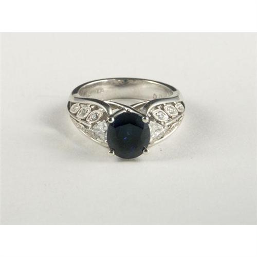 RING: Intricate 18k white gold lady's ring set with a medium dark blue sapphire and accented by diamonds in the form of plants. The oval cut sapphire measures approximately 3.04 cts and is transparent. The trillion and round cut diamonds measure approximately 0.30 ctw, have VS2 to SI2 clarity and F, G, and H color. Appraisal included.
