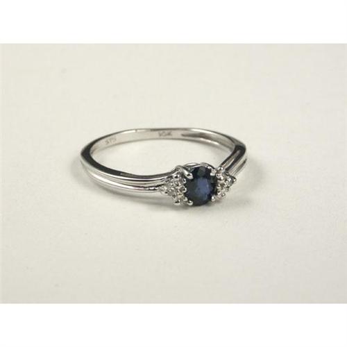 RING: Dainty 10k white gold lady's ring set with a single round cut sapphire and accented with two round cut diamonds. The fine dark blue sapphire measures approximately 0.30 cts and is transparent. The diamonds measure approximately 0.006 ctw, have SI3 clarity and I color. Appraisal included.
