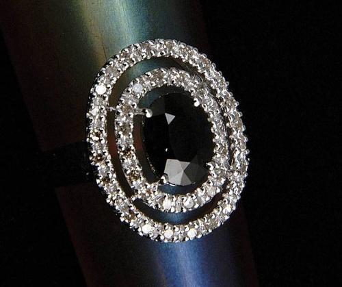 SAPPHIRE AND DIAMOND RING. 14kt white gold ladies ring has center 1.54ct oval blue sapphire surrounded by two oval bands of single cut diamonds. Total diamond weight is approx. .31ct. Crown of ring measures approx. 3/4" x 1/2". CONDITION: Very good to excellent. 5-61901