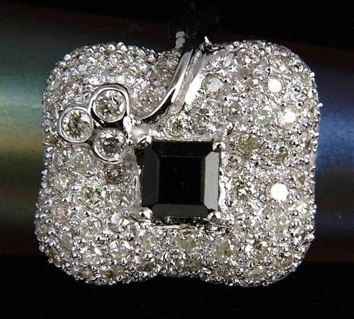 SAPPHIRE AND DIAMOND RING. 18kt white gold ladies ring has pillow shaped top completely encrusted in pavee set single cut diamonds. The pillow is topped with a square cut deep blue sapphire weighing approx. 1.65ct. One corner of pillow top is decorated with a white gold three-leaf clover with diamond set in each leaf. Total diamond weight is approx. .86ct. CONDITION: Very good to excellent. 5-61896