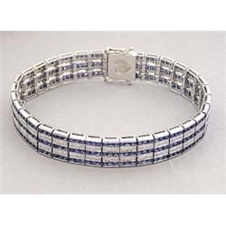 Composed of thirty-three rectangular links, set with two hundred, ninety-seven square cut sapphires weighing approximately 7.42 carats, arranged in three rows, and one hundred, ninety-eight round cut diamonds weighing approximately 1.00 carat. Mounted in eighteen karat white gold. Length 7 1/4".