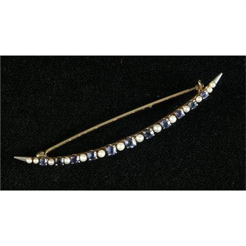 BROOCH: Dainty gold and alternating seed pearl and round cut sapphire brooch in the form of a sliver moon. Appraisal included.