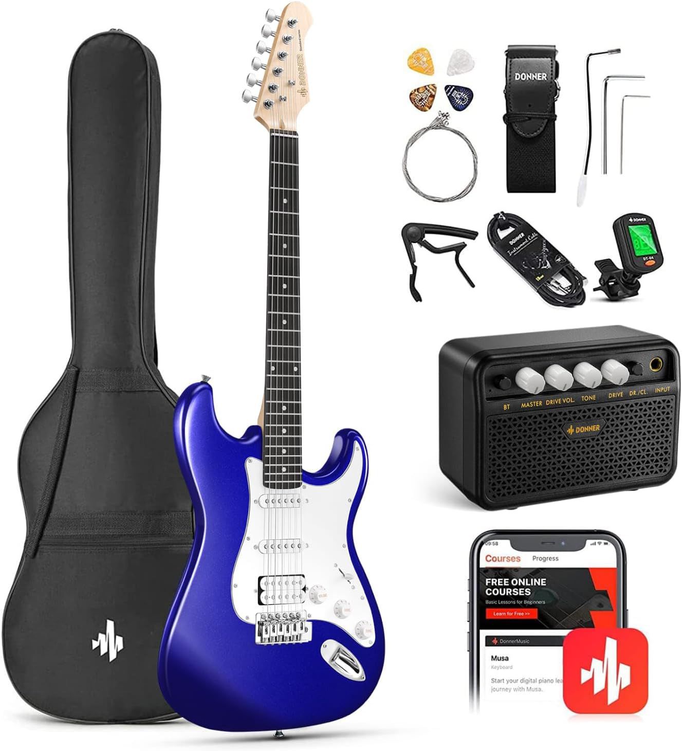39 INCHES, MODEL DST-100L. INCLUDES AMP, PICKS, TUNER, CARRY BAG & SLING STRAP (STYLE AND COLOR OF ACCESSORIES MY VARRY FROM STOCK IMAGE BUT GUITAR MATCHES)
