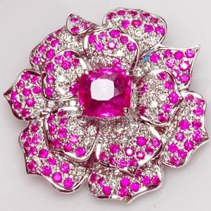 SAPPHIRE BROACH PENDANT - An 18K White Gold, Pink Sapphire and Diamond Pendant/ Brooch, containing one pink sapphire weighing approximately 3.02 carats and 78 round brilliant diamonds weighing approximately 1.04 carats and 116 round pink