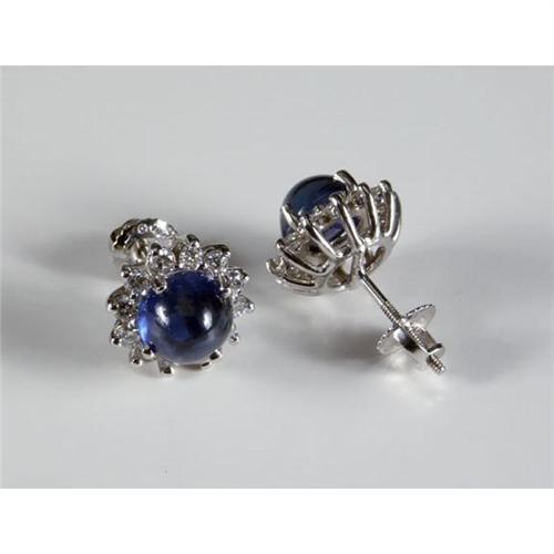EARRINGS: Elegant 18K white gold earrings set with cabochon sapphires and encircled by diamonds. The sapphires measure approximately 6.08 ctw and the diamonds measure approximately 0.96 ctw. Appraisal included.