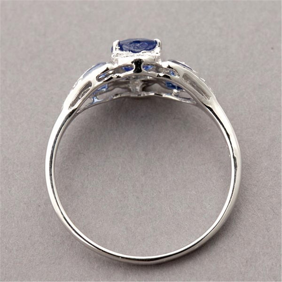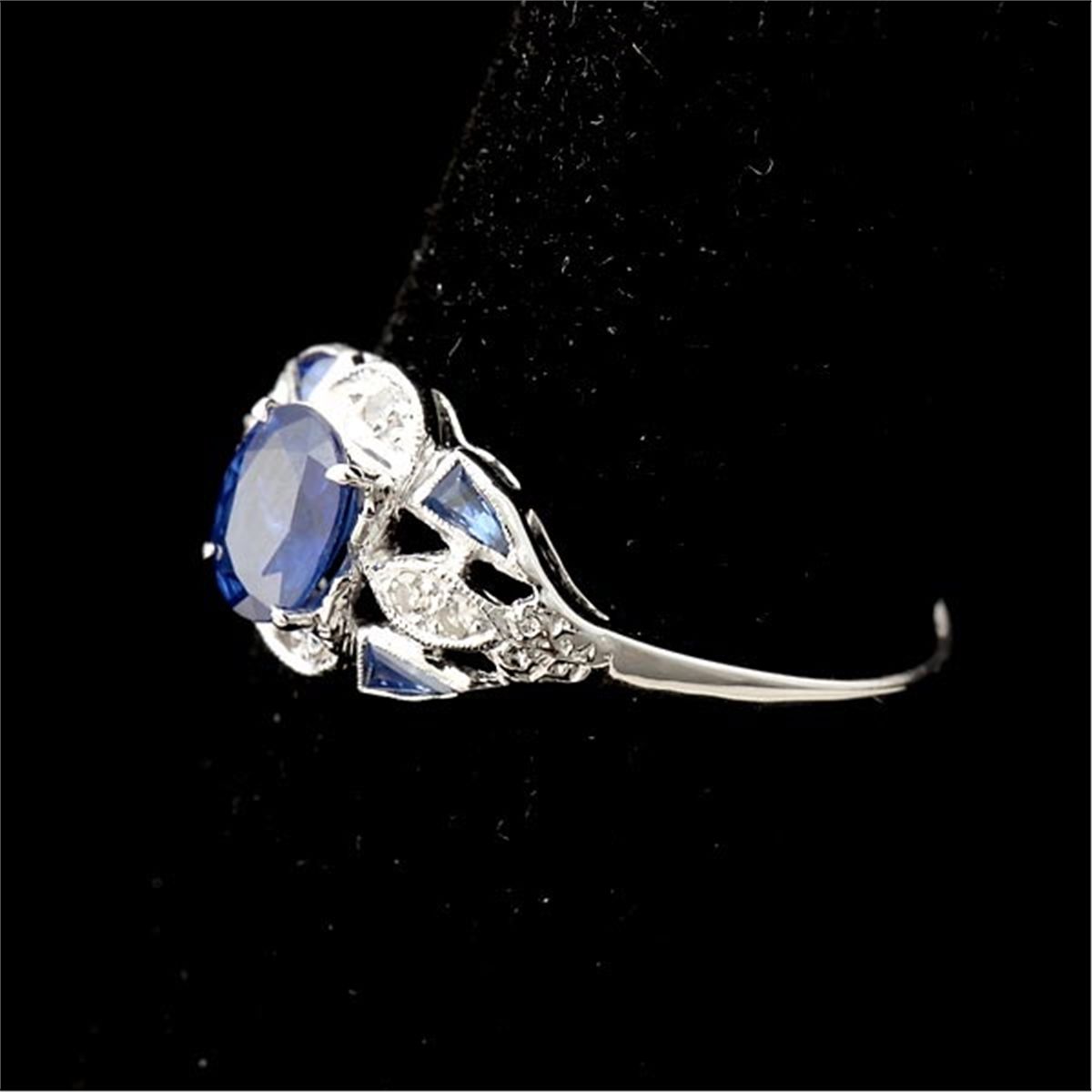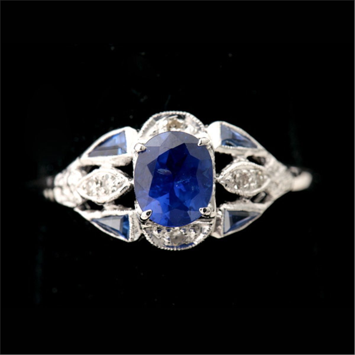 SAPPHIRE, DIAMOND, 14K WHITE GOLD RING. Centering one oval-cut sapphire, weighing approximately 0.90 ct., accented by six round-cut diamonds weighing a total of approximately 0.05 ct., set in a 14k white gold mounting. Size 7, 1.30 dwts